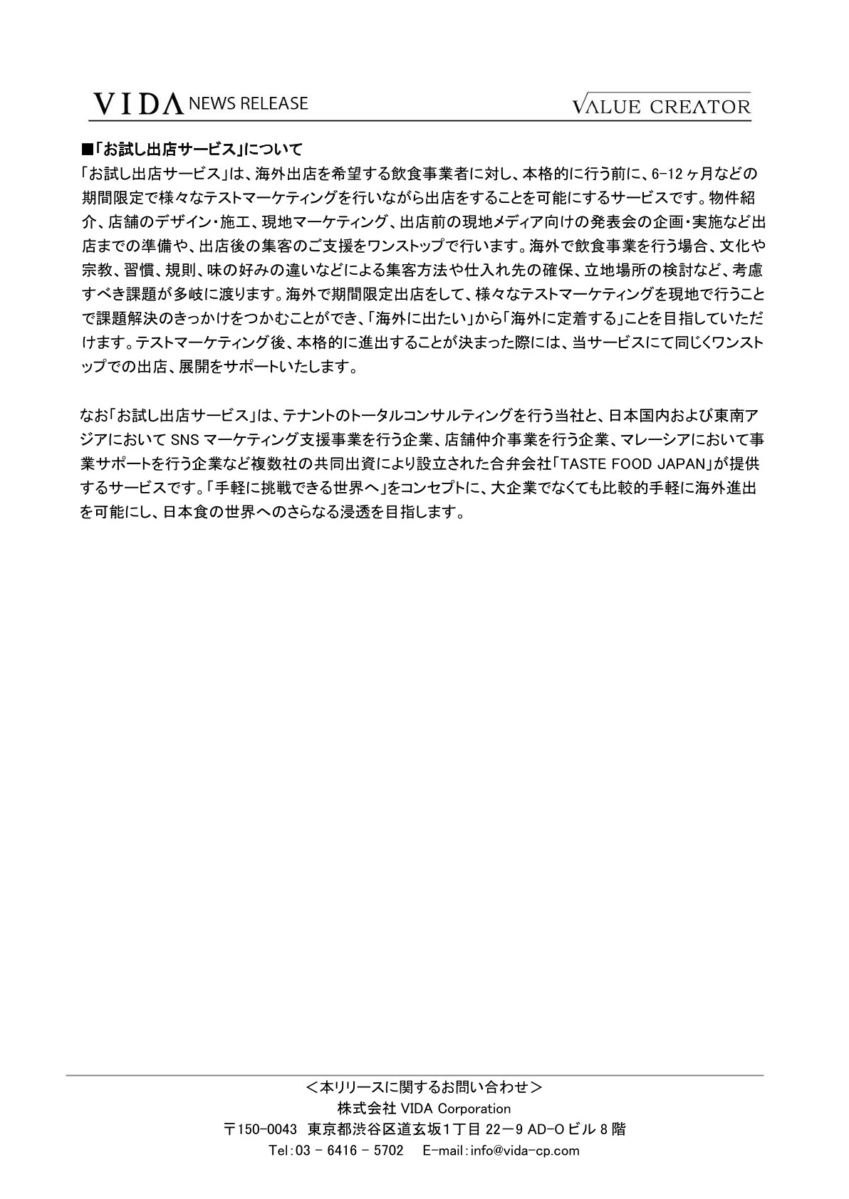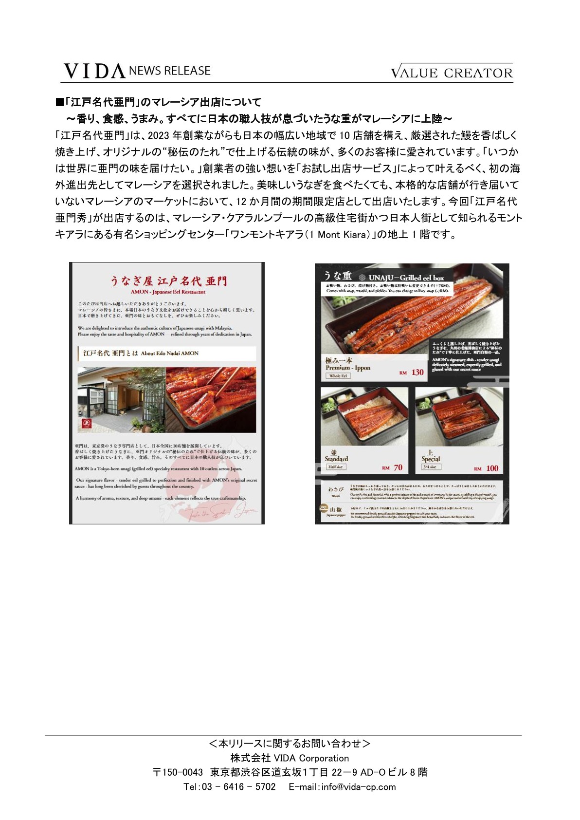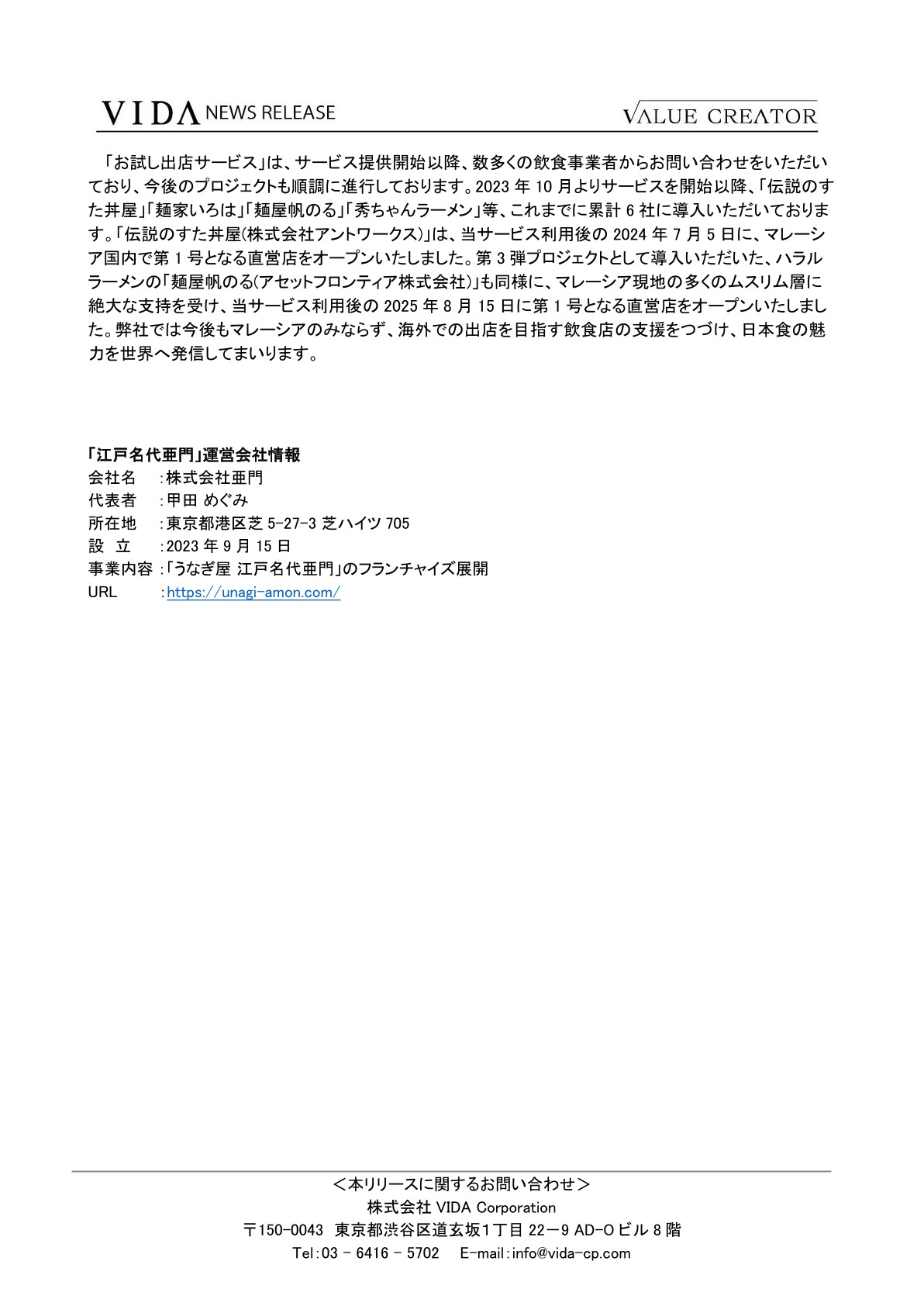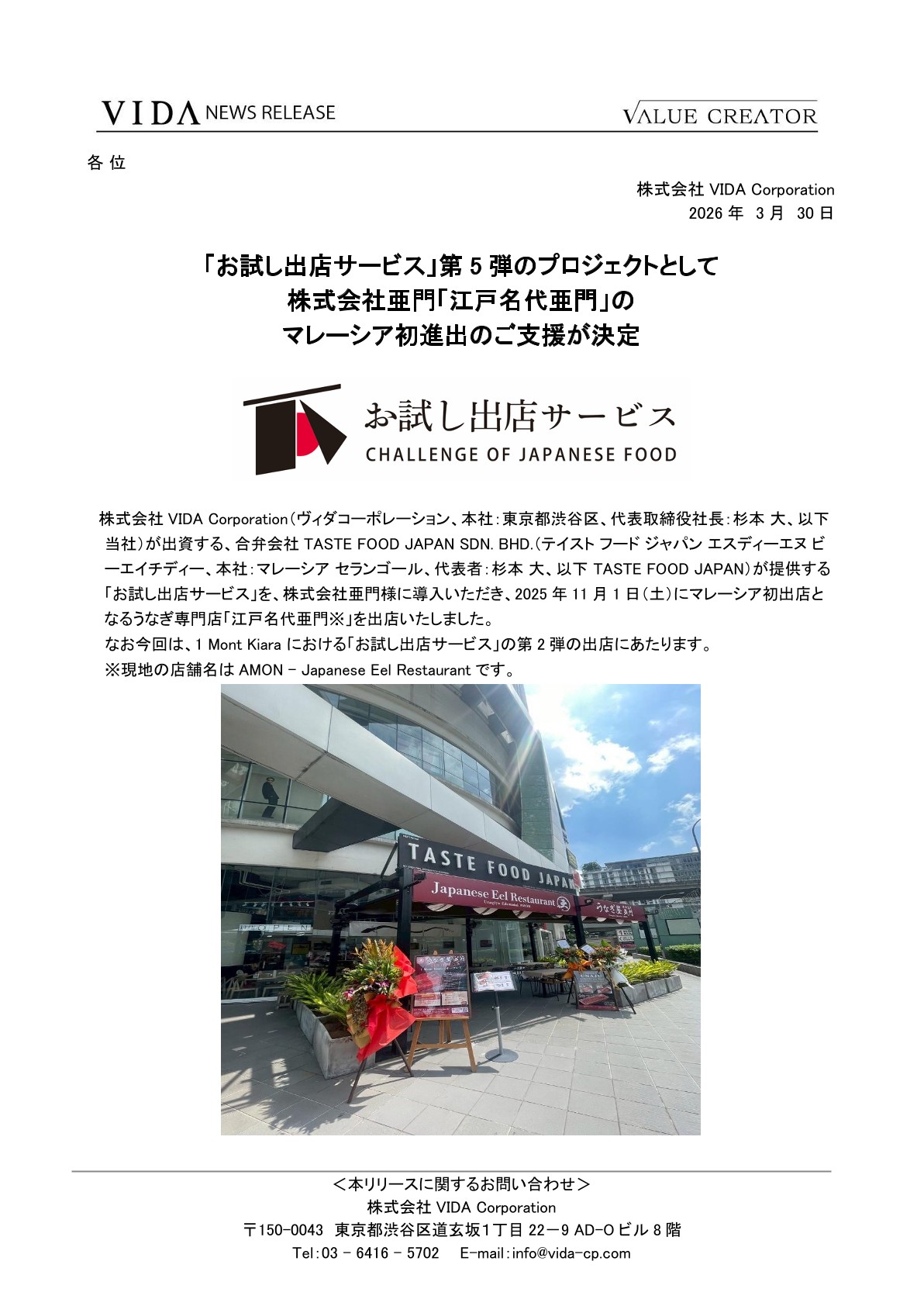 「お試し出店サービス」第5弾のプロジェクトとして株式会社亜門「江戸名代亜門」のマレーシア初進出のご支援が決定