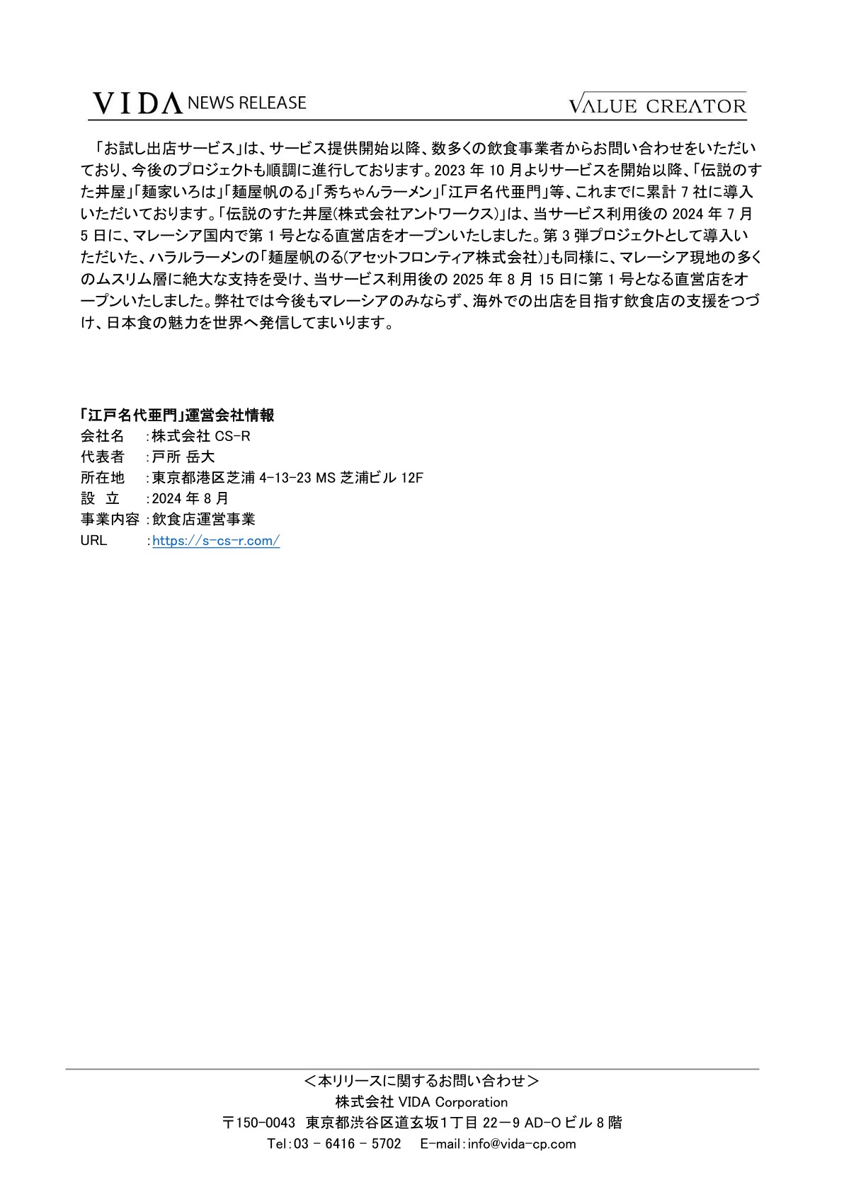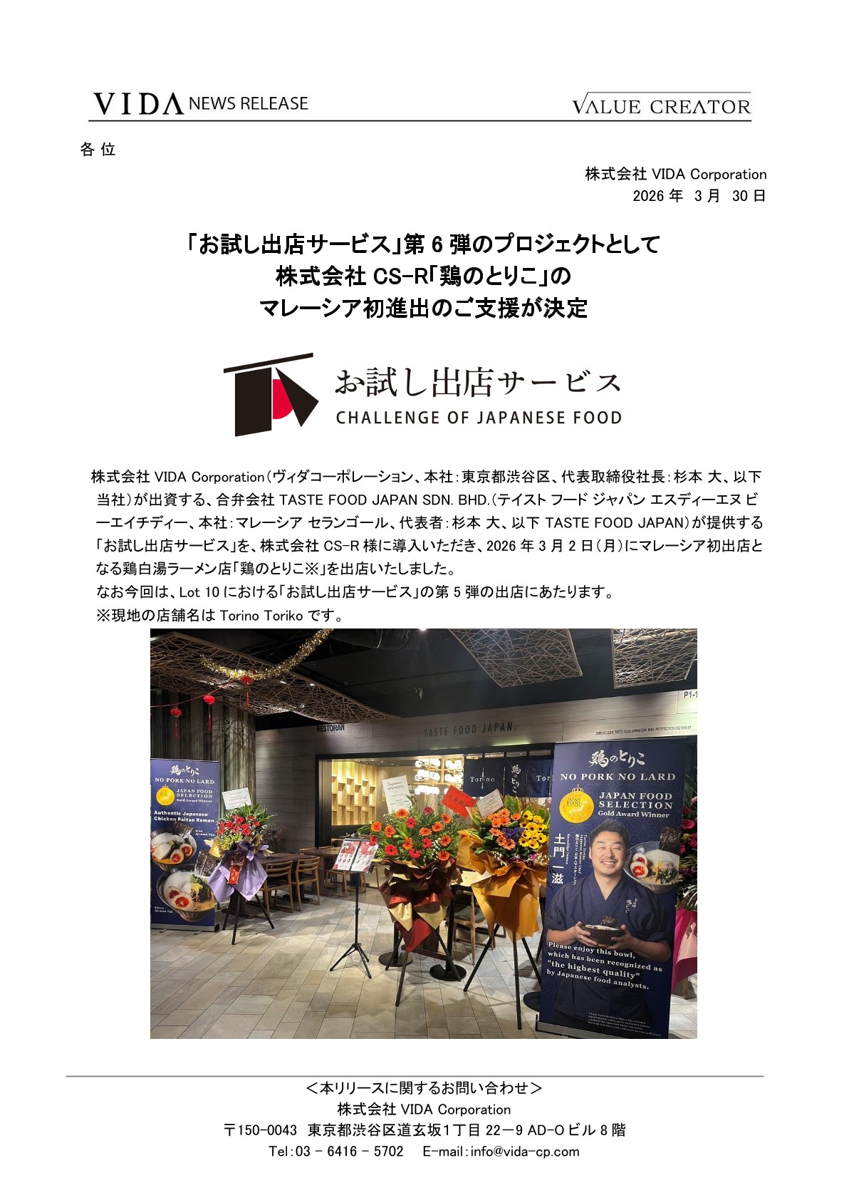 「お試し出店サービス」第6弾のプロジェクトとして株式会社CS-R「鶏のとりこ」のマレーシア初進出のご支援が決定